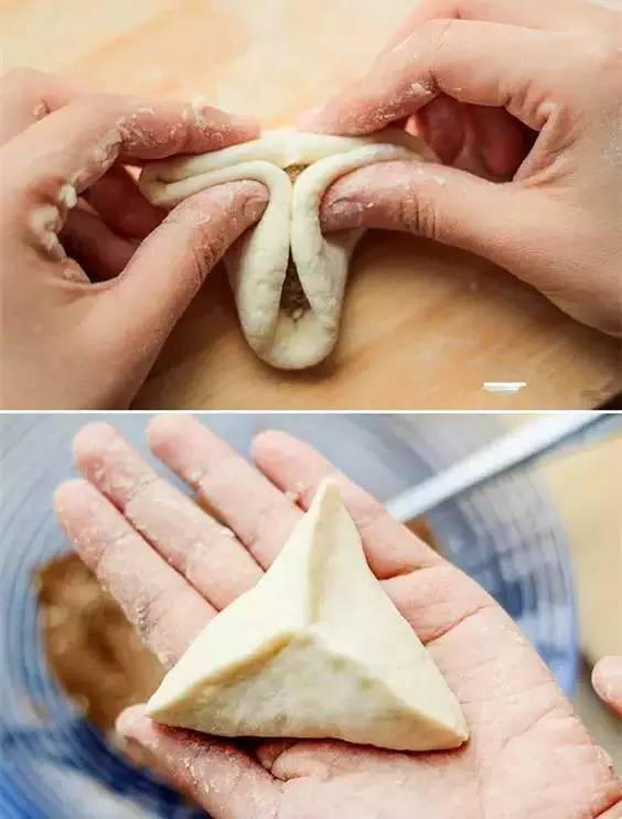 步骤三:按照图上的手法,两边大拇指将面皮像中间挤压,食指将面皮向下挤压,把面皮捏紧就成三角形啦!