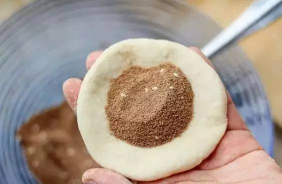 步骤二:将芝麻夹在红糖中混合,取一块面团揉成皮,把红糖放进面皮中。