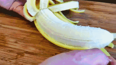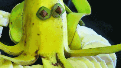 我们再来学做一个超简单的章鱼吧~香蕉皮剥开2/3,香蕉皮分成一缕一缕的,把露出部分的香蕉切掉。