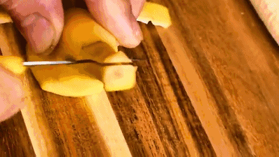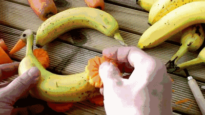 用连着的两条香蕉,斜着切一刀,切出小鸭子的头部。