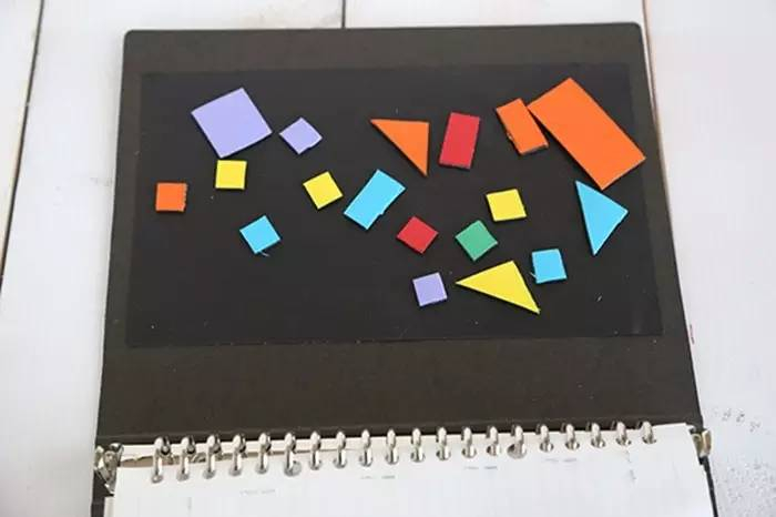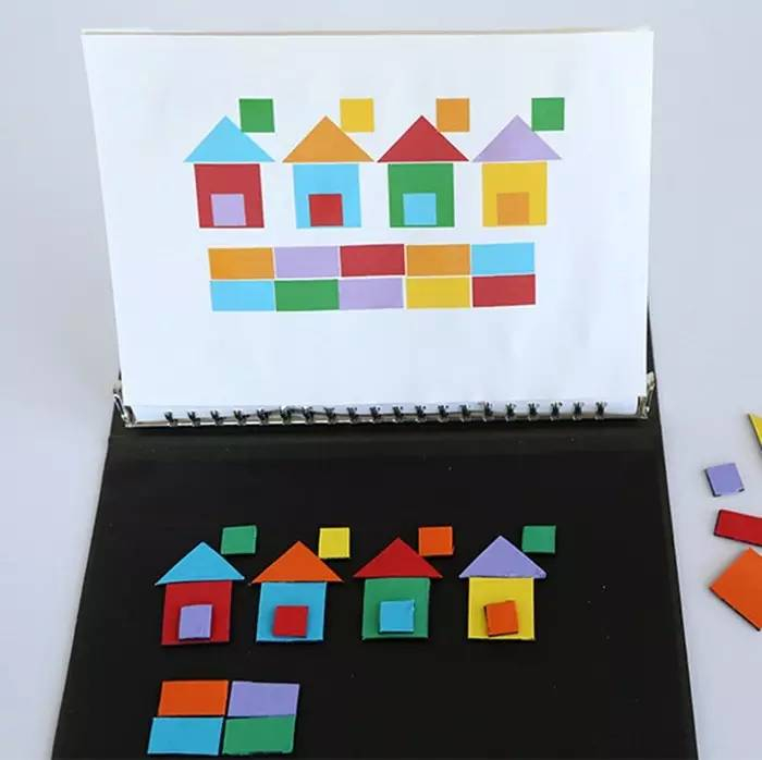 把制作好的图形贴片收纳袋和拼图模板装订在一起,就可以交到娃的手中,开始游戏啦!
