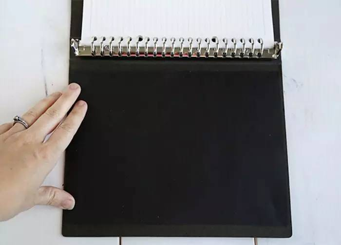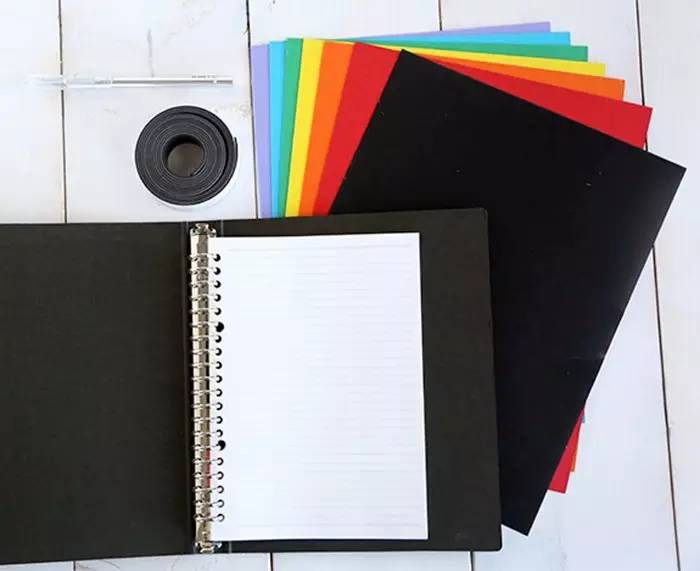 准备材料:线圈本、裁纸刀、磁铁条、彩纸、收纳袋、订书机