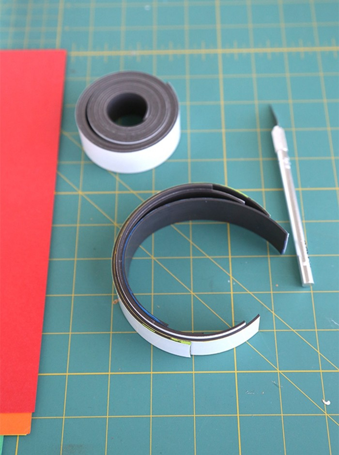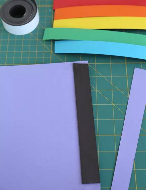 在磁铁条的一面粘贴各种颜色的彩纸。