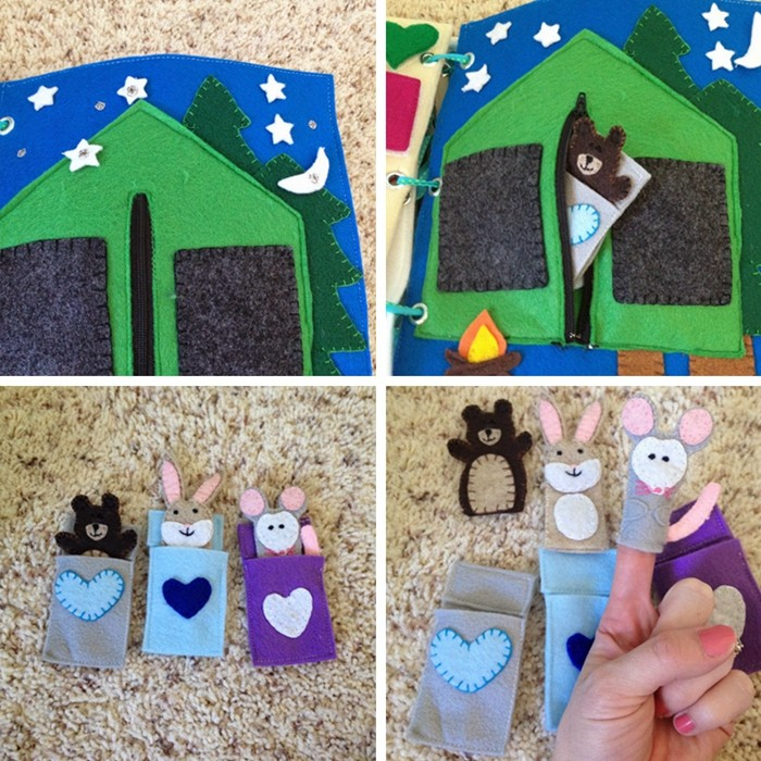 这个星空下的小帐篷可玩性超强!用按扣做成的满天星辰,用拉链条做成的帐篷门,拉开一看,里面还有三只在睡袋里的小萌宠,戴在手指上又是可爱的手偶!