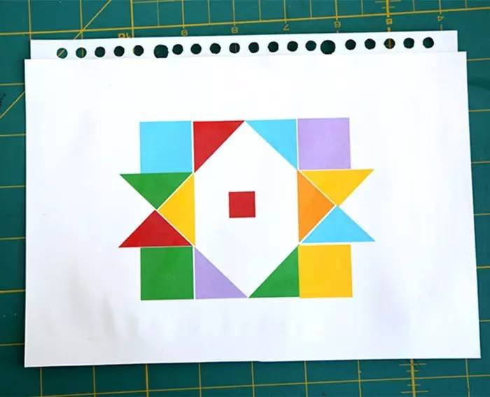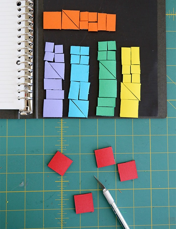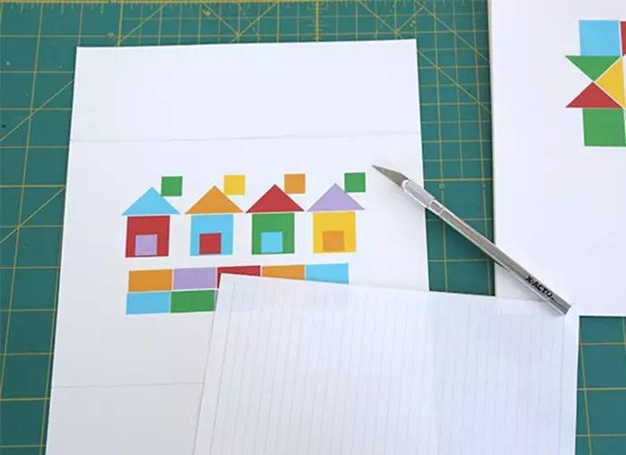 用裁纸刀裁成各种形状,比如:正方形、三角形、小正方形、长方形。
