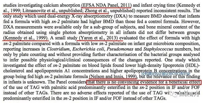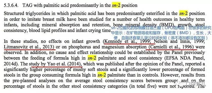 上面提到过,欧洲的食品药品监督局(EFSA)在2013年更新了关于奶粉的新标准。里面明确提到,在宝宝4-12月添加辅食之后阶段的奶粉配方中,ARA、EPA、铬、氟化物、牛磺酸、核苷酸、非消化寡糖,益生菌或合生元(益生菌和益生元的混合物),opo结构脂等这些成分对于4-12个月的宝宝来说都是没有明确有好处的成分,所以都不是必须添加的。比如EFSA的奶粉标准对OPO结构脂的详细综述: