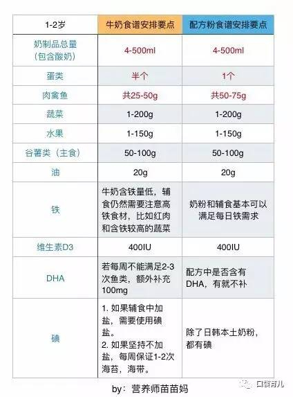 ② 碘的差异:由于牛奶中没有强化碘,很多1-2岁的家庭仍然刻意不加盐,也就是碘盐,很多家庭常见的做法是加一些调味酱油,或者用虾皮来替代食盐,这个期间,宝宝几乎是没有碘来源的,所以选择牛奶喂养的家庭,需要考虑每周给孩子1-2次低盐海苔或者海带。而奶粉中一般含有8-25ug/100ml