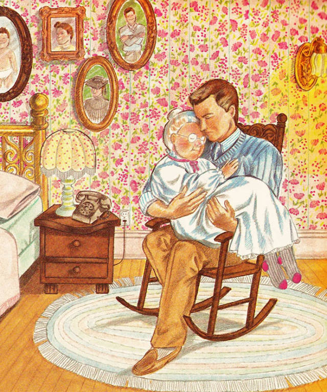 终于有一天,妈妈躺在床上奄奄一息了,儿子坐在妈妈的床边,为妈妈唱起那首老歌。当他回到自己家之后,他又把这首歌——以及这份爱的情感联结——唱给了自己刚出生的宝贝女儿。