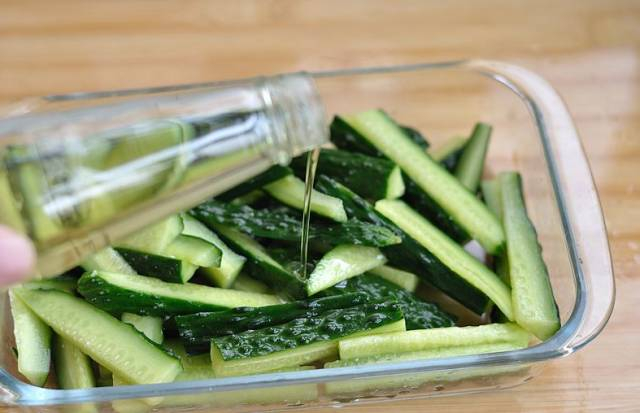 腌黄瓜:撒少许盐后放一两勺白醋搅拌均匀后腌制10到20分钟,这样腌出的黄瓜才能保持清脆。