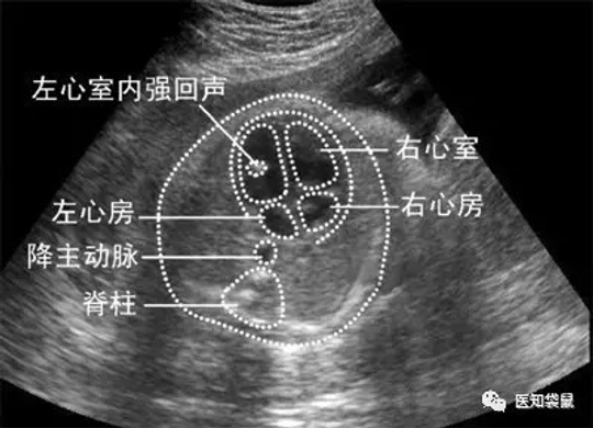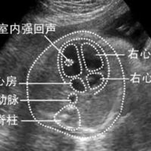 心内强回声指在乳头肌或任意心室内出现的回声与骨质强度类似的微小钙化灶,可存在于单一心室或双心室,可单发也可多发,有1.5%~4%的胎儿可出现心内强回声。