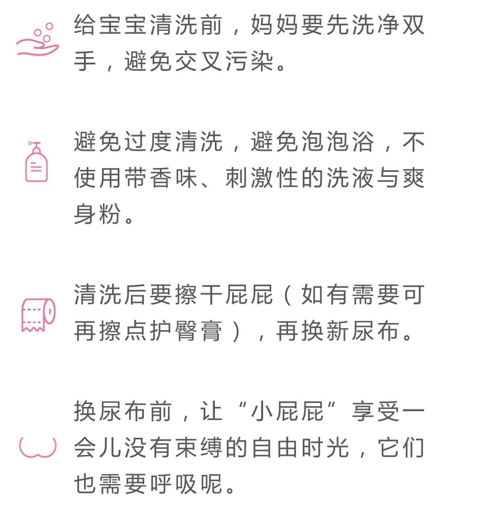 清洁完小弟弟,换新尿布时,将小弟弟朝下摆,可减少摩擦刺激。