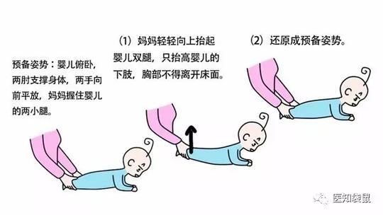1)宝宝俯卧,家长双手握住其双腿。