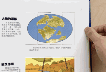 拉动纸片,观察大陆的变化。孩子可以看到恐龙时代早期的大陆是连在一起的,经过漫长的漂移,达到了现在的位置。