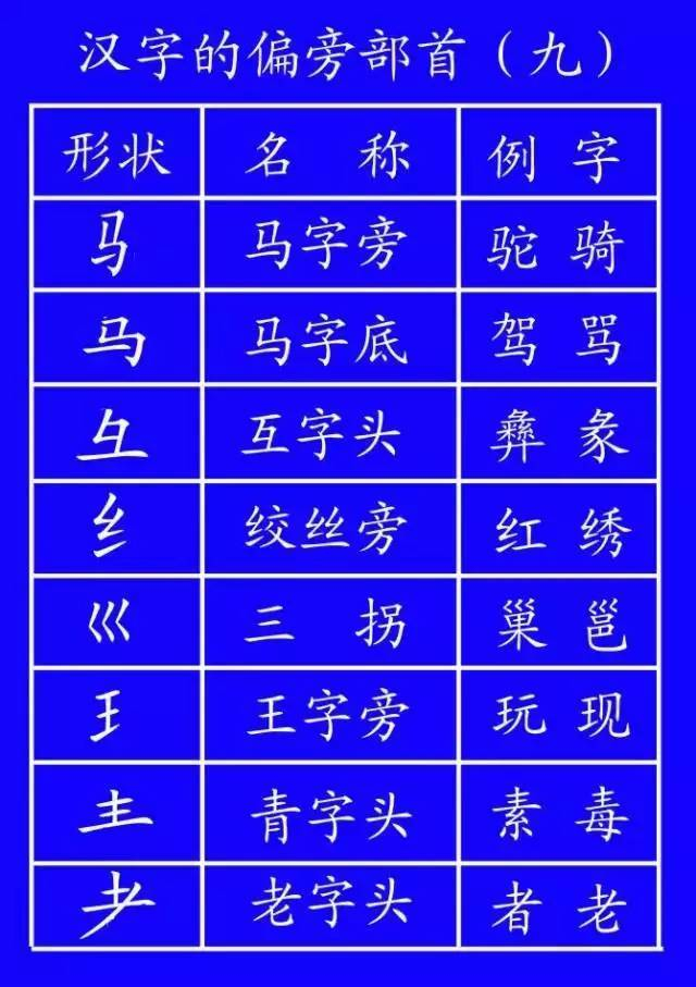 土(培场)、王(玩球)、止(歧武)、血(衅衄)、耳(取、联)、子(孙、孩)、马(驰、驶)、鸟(鸵)。