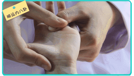操作方法:操作者用拇指面自乾向坎、运至兑为一遍,在运至离时轻轻而过,操作100次。