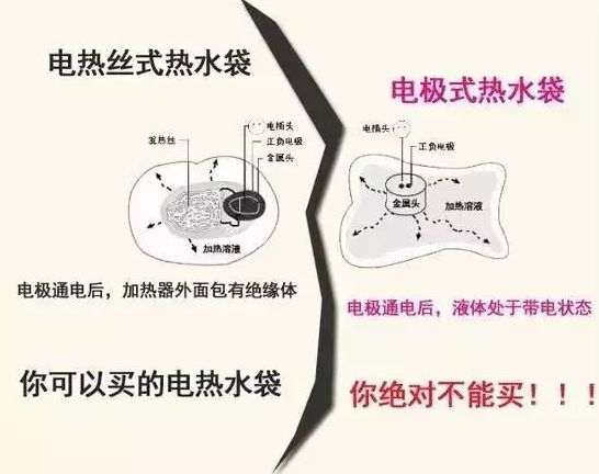 电极式热水袋:电极直接和液体接触,容易发生短路或爆炸。