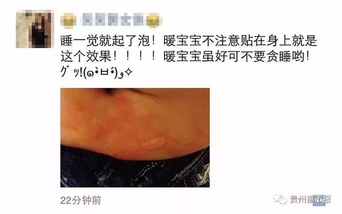 前些天,贵阳的一位郭女士就因为贴上暖宝宝睡了一个午觉,起来就满肚子水泡, 最后被检查出浅二度烫伤,需要在门诊上药治疗一周左右。像这样被暖宝宝烫伤的事,几乎每天都有几例。