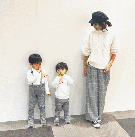 除了给自己选一条时髦的裤子,Maki在搭配亲子装时,也会注意很多细节。和孩子穿得一样时,Maki也会将自己的一截上衣塞进裤子里,从视觉上拉长腿长。