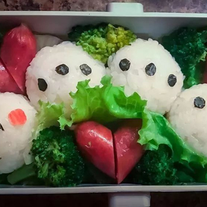 5)米饭和海苔(做寿司那种,不是零食海苔哈)真的是绝配,其貌不扬的饭团加上海苔做的五官立刻就生动起来了,要注意的是海苔遇到水分后会收缩,所以最好等饭团晾凉之后再组装上去。