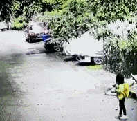 第三个例子:这个孩子因为蹲在了私家车的车尾,司机倒车时直接压了过去。