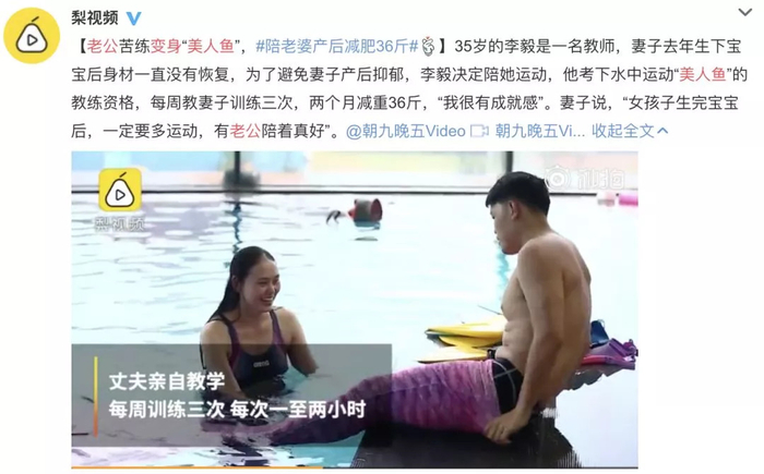 他的妻子生下宝宝后,身材一直没有恢复,为了避免妻子产后抑郁,他考了水中运动‘美人鱼’的教练资格,陪着妻子一起运动,两个月帮助妻子减重36斤。