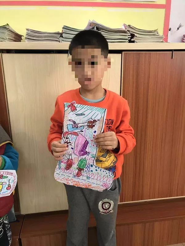 杨杨把这幅画送给了园长,园长拍下了他和那幅画的合影。