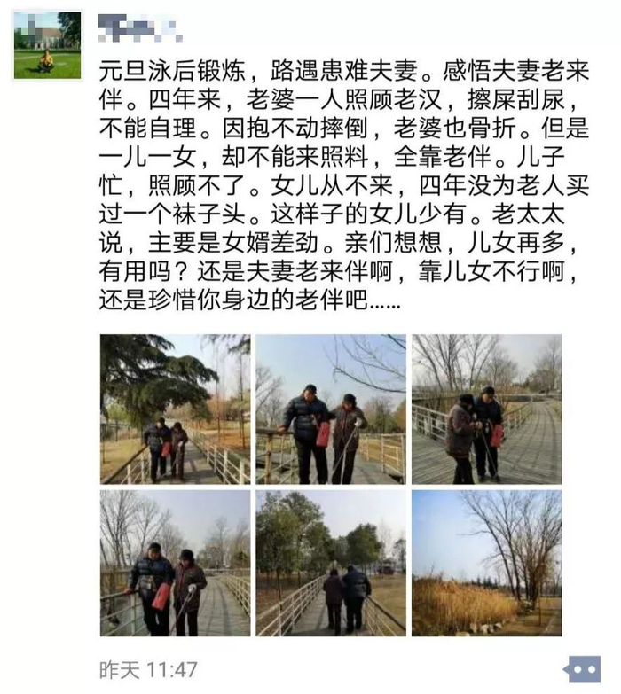 内心非常复杂的兄长,把两位老人患难与共的身影,拍成6张照片,发到朋友圈里,无比感慨地说: