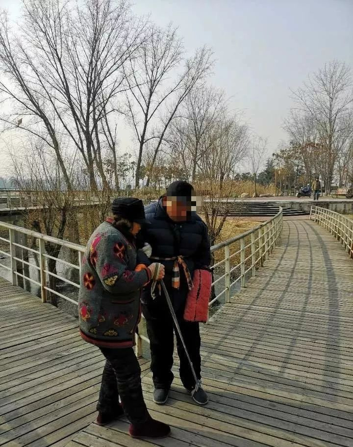 老先生偏瘫,右边身体不听使唤,耷拉的左胳膊戴着保暖套,僵硬的左腿绑着绳子,由老伴儿搀扶着,在新年第一天仍康复锻炼,练习走路。