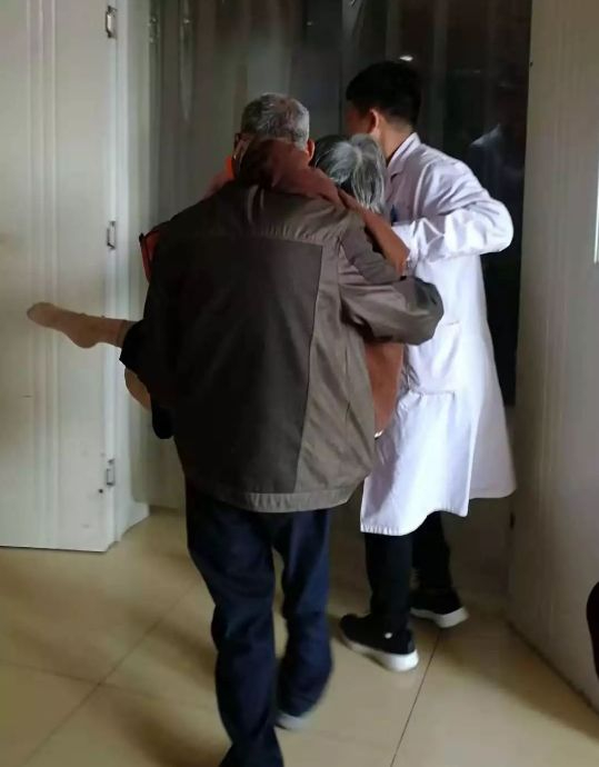 70多岁的老先生,弓着腰气喘吁吁地抱着双脚受伤的老太太,边艰难地往检查室里挪,边无助地小声嘟囔: