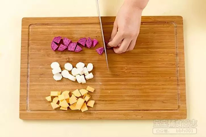 2。分别将紫薯、红薯、山药洗净去皮,切成小块备用;