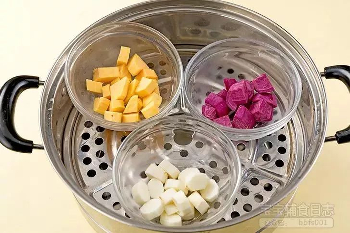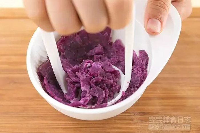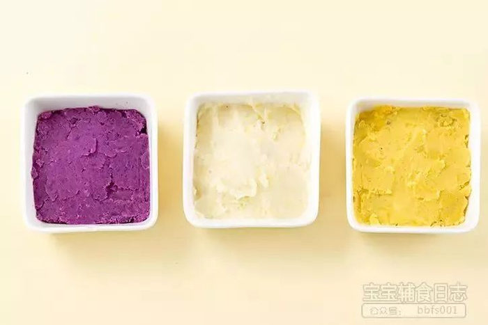 5。将蒸熟的紫薯、红薯、山药分别用研磨碗研磨成泥状,如果太干的话,可以适量添加配方奶,一岁以上可以添加牛奶;
