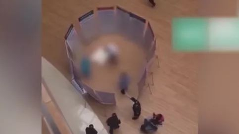 2018年8月9日,湖北一个3岁的小男孩自己在3楼扶手电梯口玩耍。