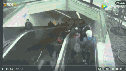 让人心惊的是,后面的妈妈着急地拉着女儿往前跑,女儿趴在电梯上。