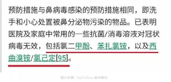 根据 UTD 资料显示:已表明医院以及家庭中常用的一些抗菌/消毒溶液对冠状病毒无效,包括氯二甲酚、苯扎氯铵以及西曲溴铵/氯己定等。