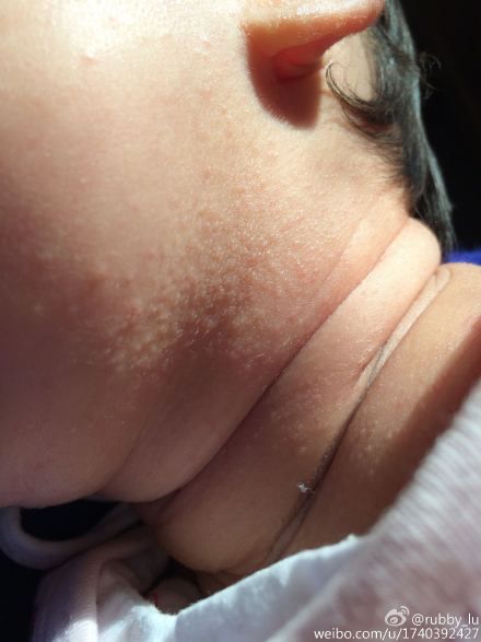 用户:一个月12天的女宝宝 脸颊 鼻翼两侧 眼皮上 脖子上 耳朵上起了好多图片上的东西 这是湿疹还是痱子呢 最开始是脖子上先有的 我该怎么做呢